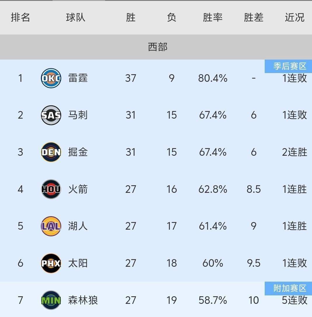 积分榜的更新让所有人大吃一惊。 马刺31胜15负的战绩,已经被掘金完全追平,仅仅凭借胜负关系勉强排在西部第二。 火箭27胜16负紧随其后,只落后马刺1个负场,这意味着接下来任何一场比赛的胜负都可能改变排名顺序。